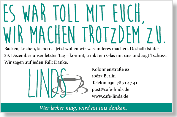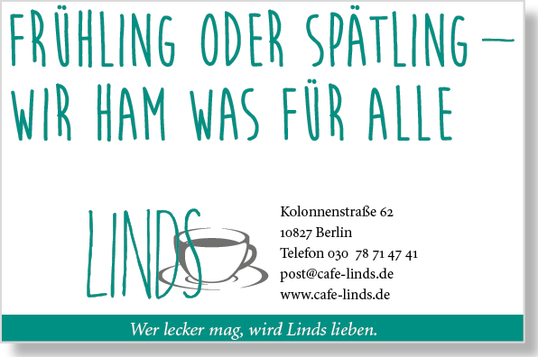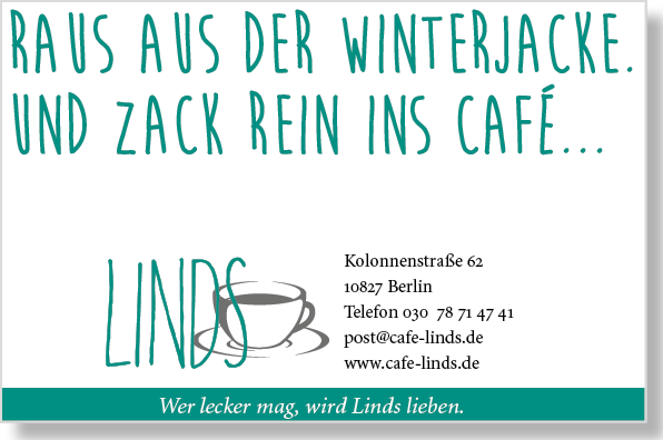 Wer lecker mag. Café Linds – ein tolles Konzept, beste Qualität und unglaublich nette Menschen. Hier kommt das »Best Of« der Anzeigen, Postkarten und der Schokomuffin Wandkleber ... das Linds schloss seine Türen aus dem besten Grund, den es dafür gibt: das zweite Baby.